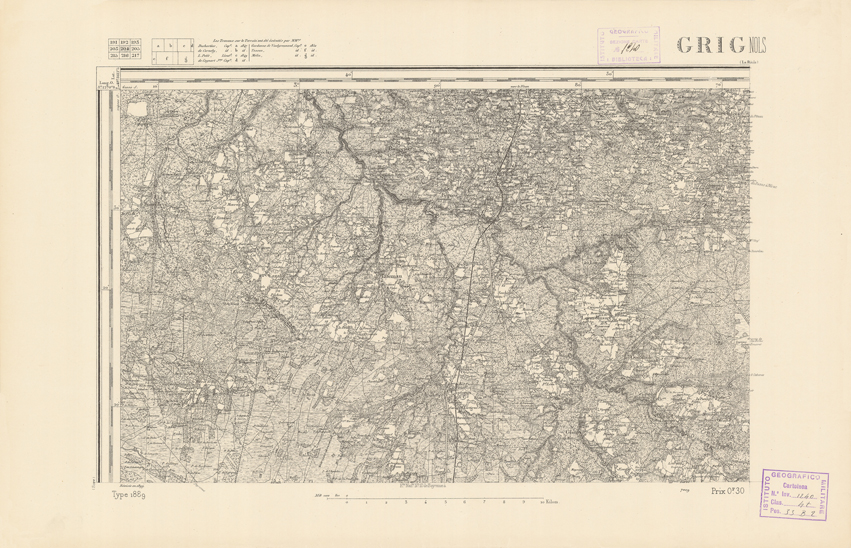 "Paris. Service Géographique de l'Armée, 1889. Ebbe origine dall'Edizione zincografica in quarti di foglio, stabilita dal 1879, per la carta detta de "L'Etat-Major". Infatti non rispondono più il sistema della riproduzione zincografica alle esigenze che la revisione dei fogli imponeva, per un inevitabile logoramento dei rami originali, fu proposta dapprima la correzione degli zinchi, ma questo, importando un lavoro lungo e gravoso, si adottò il procedimento galvanico. I rami galvanici ottenuti e corretti secondo questo sistema presero il nome di "édition type 1889". Allo scopo di facilitare l'incisione fu adoperata la suddivisione in quarti di foglio come per l'edizione zincografica. La revisione dei fogli di questo tipo non fu iniziata che nel 1893. Dal catalogo del S.G.A. risultano mancanti a questa edizione i dipartimenti della "Moselle", del "Bas-Rhin" e del "Haut-Rhin" per i quali non esiste che una edizione in fogli interi aggiornata nel 1901."