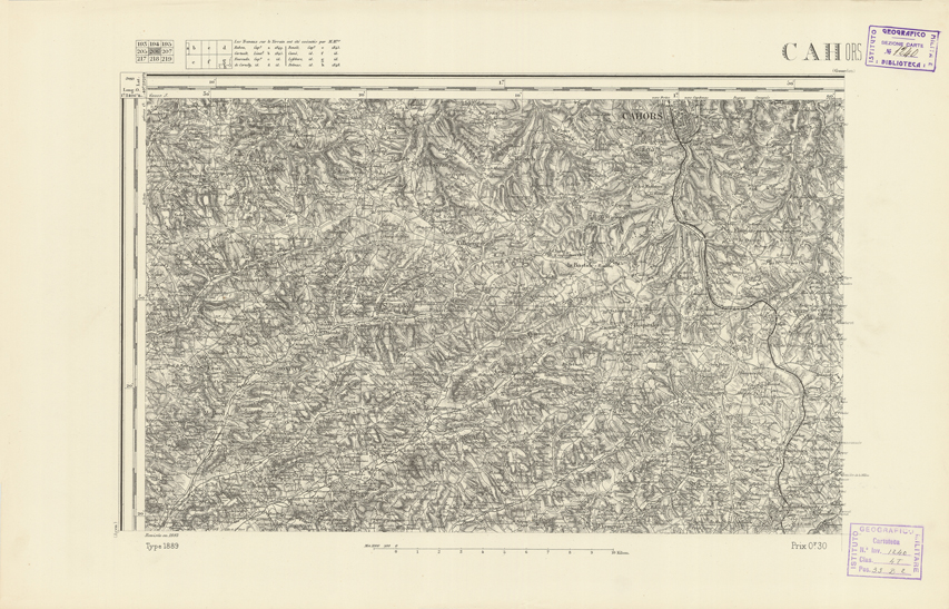 "Paris. Service Géographique de l'Armée, 1889. Ebbe origine dall'Edizione zincografica in quarti di foglio, stabilita dal 1879, per la carta detta de "L'Etat-Major". Infatti non rispondono più il sistema della riproduzione zincografica alle esigenze che la revisione dei fogli imponeva, per un inevitabile logoramento dei rami originali, fu proposta dapprima la correzione degli zinchi, ma questo, importando un lavoro lungo e gravoso, si adottò il procedimento galvanico. I rami galvanici ottenuti e corretti secondo questo sistema presero il nome di "édition type 1889". Allo scopo di facilitare l'incisione fu adoperata la suddivisione in quarti di foglio come per l'edizione zincografica. La revisione dei fogli di questo tipo non fu iniziata che nel 1893. Dal catalogo del S.G.A. risultano mancanti a questa edizione i dipartimenti della "Moselle", del "Bas-Rhin" e del "Haut-Rhin" per i quali non esiste che una edizione in fogli interi aggiornata nel 1901."