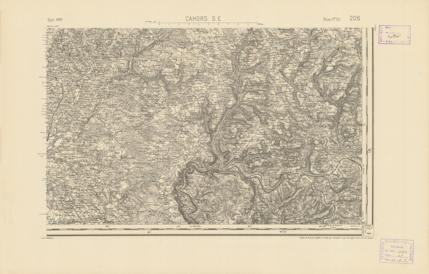 "Paris. Service Géographique de l'Armée, 1889. Ebbe origine dall'Edizione zincografica in quarti di foglio, stabilita dal 1879, per la carta detta de "L'Etat-Major". Infatti non rispondono più il sistema della riproduzione zincografica alle esigenze che la revisione dei fogli imponeva, per un inevitabile logoramento dei rami originali, fu proposta dapprima la correzione degli zinchi, ma questo, importando un lavoro lungo e gravoso, si adottò il procedimento galvanico. I rami galvanici ottenuti e corretti secondo questo sistema presero il nome di "édition type 1889". Allo scopo di facilitare l'incisione fu adoperata la suddivisione in quarti di foglio come per l'edizione zincografica. La revisione dei fogli di questo tipo non fu iniziata che nel 1893. Dal catalogo del S.G.A. risultano mancanti a questa edizione i dipartimenti della "Moselle", del "Bas-Rhin" e del "Haut-Rhin" per i quali non esiste che una edizione in fogli interi aggiornata nel 1901."