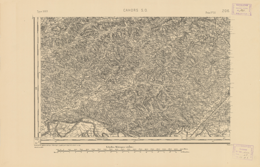 "Paris. Service Géographique de l'Armée, 1889. Ebbe origine dall'Edizione zincografica in quarti di foglio, stabilita dal 1879, per la carta detta de "L'Etat-Major". Infatti non rispondono più il sistema della riproduzione zincografica alle esigenze che la revisione dei fogli imponeva, per un inevitabile logoramento dei rami originali, fu proposta dapprima la correzione degli zinchi, ma questo, importando un lavoro lungo e gravoso, si adottò il procedimento galvanico. I rami galvanici ottenuti e corretti secondo questo sistema presero il nome di "édition type 1889". Allo scopo di facilitare l'incisione fu adoperata la suddivisione in quarti di foglio come per l'edizione zincografica. La revisione dei fogli di questo tipo non fu iniziata che nel 1893. Dal catalogo del S.G.A. risultano mancanti a questa edizione i dipartimenti della "Moselle", del "Bas-Rhin" e del "Haut-Rhin" per i quali non esiste che una edizione in fogli interi aggiornata nel 1901."