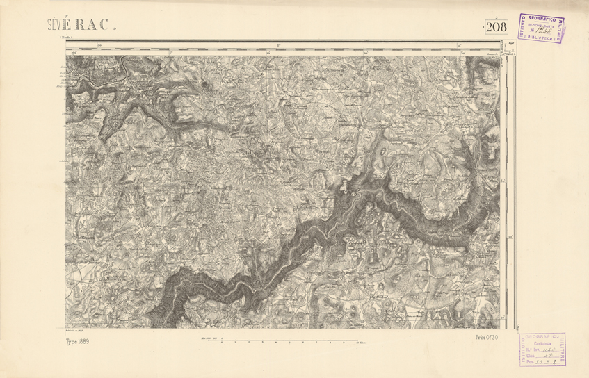 "Paris. Service Géographique de l'Armée, 1889. Ebbe origine dall'Edizione zincografica in quarti di foglio, stabilita dal 1879, per la carta detta de "L'Etat-Major". Infatti non rispondono più il sistema della riproduzione zincografica alle esigenze che la revisione dei fogli imponeva, per un inevitabile logoramento dei rami originali, fu proposta dapprima la correzione degli zinchi, ma questo, importando un lavoro lungo e gravoso, si adottò il procedimento galvanico. I rami galvanici ottenuti e corretti secondo questo sistema presero il nome di "édition type 1889". Allo scopo di facilitare l'incisione fu adoperata la suddivisione in quarti di foglio come per l'edizione zincografica. La revisione dei fogli di questo tipo non fu iniziata che nel 1893. Dal catalogo del S.G.A. risultano mancanti a questa edizione i dipartimenti della "Moselle", del "Bas-Rhin" e del "Haut-Rhin" per i quali non esiste che una edizione in fogli interi aggiornata nel 1901."