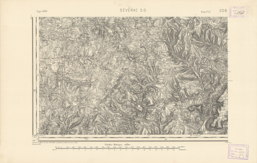 "Paris. Service Géographique de l'Armée, 1889. Ebbe origine dall'Edizione zincografica in quarti di foglio, stabilita dal 1879, per la carta detta de "L'Etat-Major". Infatti non rispondono più il sistema della riproduzione zincografica alle esigenze che la revisione dei fogli imponeva, per un inevitabile logoramento dei rami originali, fu proposta dapprima la correzione degli zinchi, ma questo, importando un lavoro lungo e gravoso, si adottò il procedimento galvanico. I rami galvanici ottenuti e corretti secondo questo sistema presero il nome di "édition type 1889". Allo scopo di facilitare l'incisione fu adoperata la suddivisione in quarti di foglio come per l'edizione zincografica. La revisione dei fogli di questo tipo non fu iniziata che nel 1893. Dal catalogo del S.G.A. risultano mancanti a questa edizione i dipartimenti della "Moselle", del "Bas-Rhin" e del "Haut-Rhin" per i quali non esiste che una edizione in fogli interi aggiornata nel 1901."