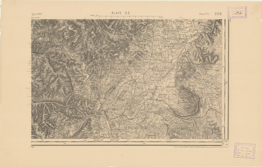 "Paris. Service Géographique de l'Armée, 1889. Ebbe origine dall'Edizione zincografica in quarti di foglio, stabilita dal 1879, per la carta detta de "L'Etat-Major". Infatti non rispondono più il sistema della riproduzione zincografica alle esigenze che la revisione dei fogli imponeva, per un inevitabile logoramento dei rami originali, fu proposta dapprima la correzione degli zinchi, ma questo, importando un lavoro lungo e gravoso, si adottò il procedimento galvanico. I rami galvanici ottenuti e corretti secondo questo sistema presero il nome di "édition type 1889". Allo scopo di facilitare l'incisione fu adoperata la suddivisione in quarti di foglio come per l'edizione zincografica. La revisione dei fogli di questo tipo non fu iniziata che nel 1893. Dal catalogo del S.G.A. risultano mancanti a questa edizione i dipartimenti della "Moselle", del "Bas-Rhin" e del "Haut-Rhin" per i quali non esiste che una edizione in fogli interi aggiornata nel 1901."