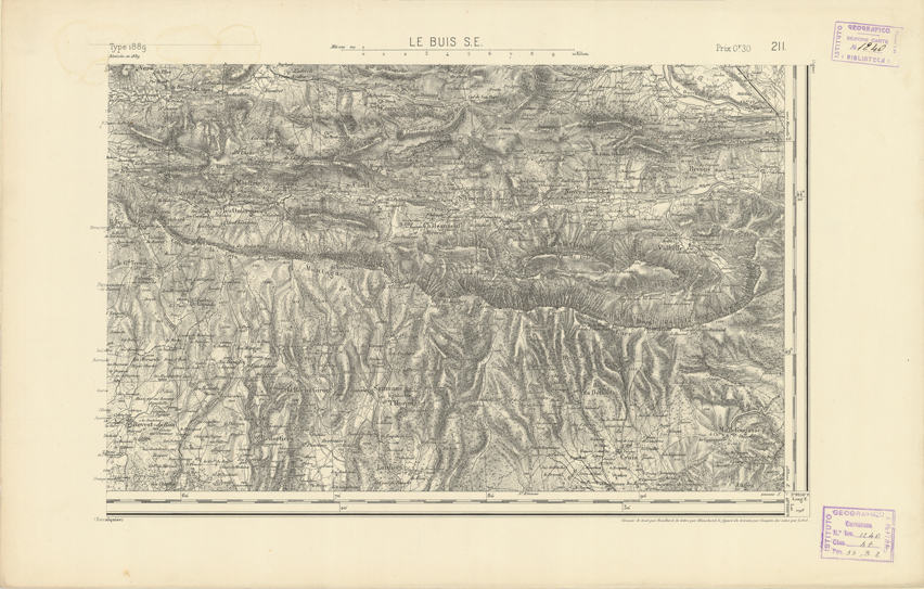 "Paris. Service Géographique de l'Armée, 1889. Ebbe origine dall'Edizione zincografica in quarti di foglio, stabilita dal 1879, per la carta detta de "L'Etat-Major". Infatti non rispondono più il sistema della riproduzione zincografica alle esigenze che la revisione dei fogli imponeva, per un inevitabile logoramento dei rami originali, fu proposta dapprima la correzione degli zinchi, ma questo, importando un lavoro lungo e gravoso, si adottò il procedimento galvanico. I rami galvanici ottenuti e corretti secondo questo sistema presero il nome di "édition type 1889". Allo scopo di facilitare l'incisione fu adoperata la suddivisione in quarti di foglio come per l'edizione zincografica. La revisione dei fogli di questo tipo non fu iniziata che nel 1893. Dal catalogo del S.G.A. risultano mancanti a questa edizione i dipartimenti della "Moselle", del "Bas-Rhin" e del "Haut-Rhin" per i quali non esiste che una edizione in fogli interi aggiornata nel 1901."