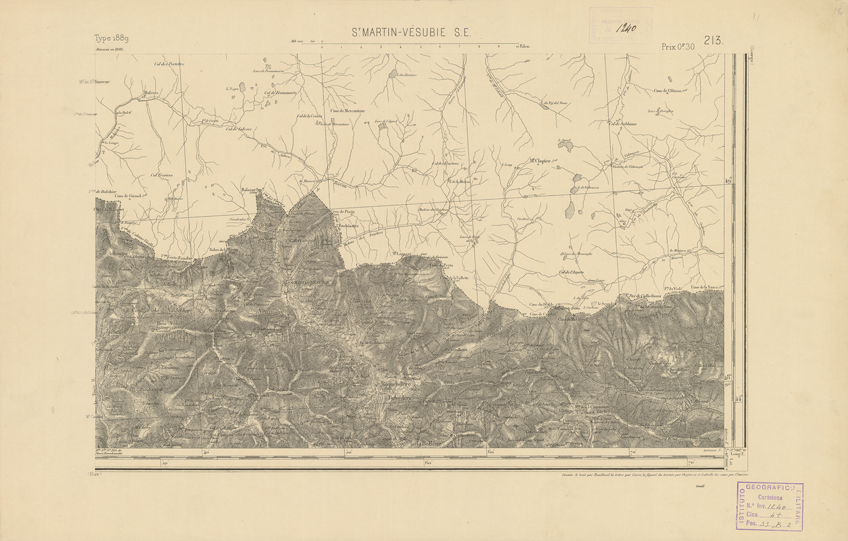 "Paris. Service Géographique de l'Armée, 1889. Ebbe origine dall'Edizione zincografica in quarti di foglio, stabilita dal 1879, per la carta detta de "L'Etat-Major". Infatti non rispondono più il sistema della riproduzione zincografica alle esigenze che la revisione dei fogli imponeva, per un inevitabile logoramento dei rami originali, fu proposta dapprima la correzione degli zinchi, ma questo, importando un lavoro lungo e gravoso, si adottò il procedimento galvanico. I rami galvanici ottenuti e corretti secondo questo sistema presero il nome di "édition type 1889". Allo scopo di facilitare l'incisione fu adoperata la suddivisione in quarti di foglio come per l'edizione zincografica. La revisione dei fogli di questo tipo non fu iniziata che nel 1893. Dal catalogo del S.G.A. risultano mancanti a questa edizione i dipartimenti della "Moselle", del "Bas-Rhin" e del "Haut-Rhin" per i quali non esiste che una edizione in fogli interi aggiornata nel 1901."