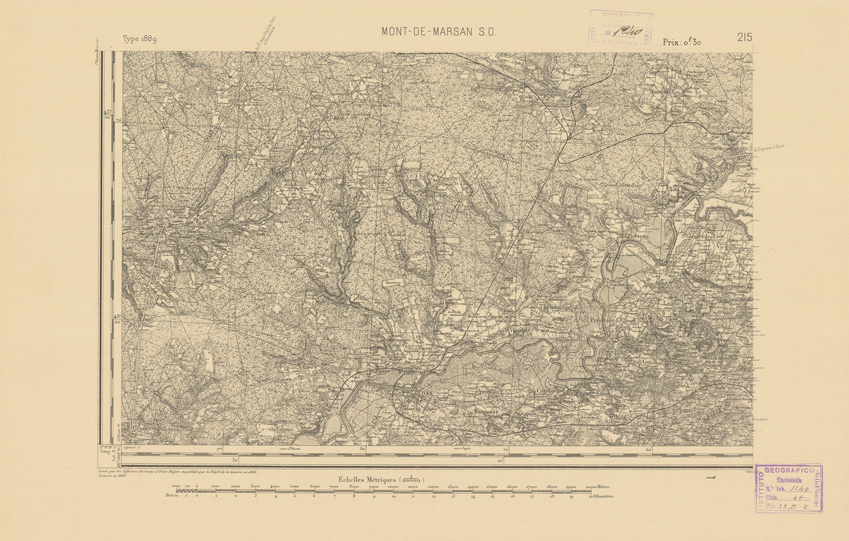 "Paris. Service Géographique de l'Armée, 1889. Ebbe origine dall'Edizione zincografica in quarti di foglio, stabilita dal 1879, per la carta detta de "L'Etat-Major". Infatti non rispondono più il sistema della riproduzione zincografica alle esigenze che la revisione dei fogli imponeva, per un inevitabile logoramento dei rami originali, fu proposta dapprima la correzione degli zinchi, ma questo, importando un lavoro lungo e gravoso, si adottò il procedimento galvanico. I rami galvanici ottenuti e corretti secondo questo sistema presero il nome di "édition type 1889". Allo scopo di facilitare l'incisione fu adoperata la suddivisione in quarti di foglio come per l'edizione zincografica. La revisione dei fogli di questo tipo non fu iniziata che nel 1893. Dal catalogo del S.G.A. risultano mancanti a questa edizione i dipartimenti della "Moselle", del "Bas-Rhin" e del "Haut-Rhin" per i quali non esiste che una edizione in fogli interi aggiornata nel 1901."