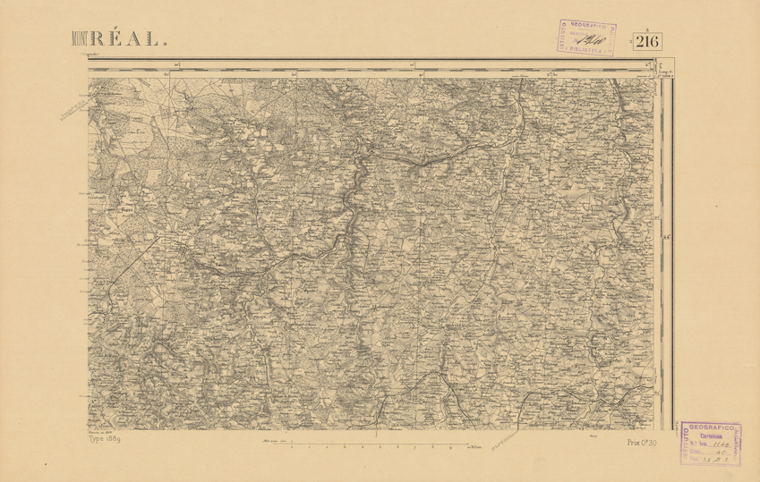 "Paris. Service Géographique de l'Armée, 1889. Ebbe origine dall'Edizione zincografica in quarti di foglio, stabilita dal 1879, per la carta detta de "L'Etat-Major". Infatti non rispondono più il sistema della riproduzione zincografica alle esigenze che la revisione dei fogli imponeva, per un inevitabile logoramento dei rami originali, fu proposta dapprima la correzione degli zinchi, ma questo, importando un lavoro lungo e gravoso, si adottò il procedimento galvanico. I rami galvanici ottenuti e corretti secondo questo sistema presero il nome di "édition type 1889". Allo scopo di facilitare l'incisione fu adoperata la suddivisione in quarti di foglio come per l'edizione zincografica. La revisione dei fogli di questo tipo non fu iniziata che nel 1893. Dal catalogo del S.G.A. risultano mancanti a questa edizione i dipartimenti della "Moselle", del "Bas-Rhin" e del "Haut-Rhin" per i quali non esiste che una edizione in fogli interi aggiornata nel 1901."