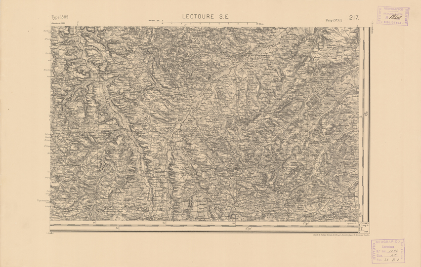 "Paris. Service Géographique de l'Armée, 1889. Ebbe origine dall'Edizione zincografica in quarti di foglio, stabilita dal 1879, per la carta detta de "L'Etat-Major". Infatti non rispondono più il sistema della riproduzione zincografica alle esigenze che la revisione dei fogli imponeva, per un inevitabile logoramento dei rami originali, fu proposta dapprima la correzione degli zinchi, ma questo, importando un lavoro lungo e gravoso, si adottò il procedimento galvanico. I rami galvanici ottenuti e corretti secondo questo sistema presero il nome di "édition type 1889". Allo scopo di facilitare l'incisione fu adoperata la suddivisione in quarti di foglio come per l'edizione zincografica. La revisione dei fogli di questo tipo non fu iniziata che nel 1893. Dal catalogo del S.G.A. risultano mancanti a questa edizione i dipartimenti della "Moselle", del "Bas-Rhin" e del "Haut-Rhin" per i quali non esiste che una edizione in fogli interi aggiornata nel 1901."