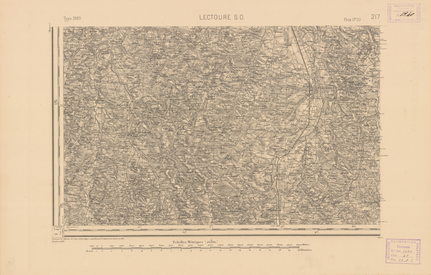 "Paris. Service Géographique de l'Armée, 1889. Ebbe origine dall'Edizione zincografica in quarti di foglio, stabilita dal 1879, per la carta detta de "L'Etat-Major". Infatti non rispondono più il sistema della riproduzione zincografica alle esigenze che la revisione dei fogli imponeva, per un inevitabile logoramento dei rami originali, fu proposta dapprima la correzione degli zinchi, ma questo, importando un lavoro lungo e gravoso, si adottò il procedimento galvanico. I rami galvanici ottenuti e corretti secondo questo sistema presero il nome di "édition type 1889". Allo scopo di facilitare l'incisione fu adoperata la suddivisione in quarti di foglio come per l'edizione zincografica. La revisione dei fogli di questo tipo non fu iniziata che nel 1893. Dal catalogo del S.G.A. risultano mancanti a questa edizione i dipartimenti della "Moselle", del "Bas-Rhin" e del "Haut-Rhin" per i quali non esiste che una edizione in fogli interi aggiornata nel 1901."