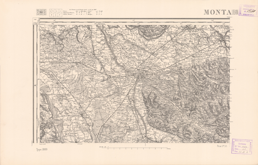 "Paris. Service Géographique de l'Armée, 1889. Ebbe origine dall'Edizione zincografica in quarti di foglio, stabilita dal 1879, per la carta detta de "L'Etat-Major". Infatti non rispondono più il sistema della riproduzione zincografica alle esigenze che la revisione dei fogli imponeva, per un inevitabile logoramento dei rami originali, fu proposta dapprima la correzione degli zinchi, ma questo, importando un lavoro lungo e gravoso, si adottò il procedimento galvanico. I rami galvanici ottenuti e corretti secondo questo sistema presero il nome di "édition type 1889". Allo scopo di facilitare l'incisione fu adoperata la suddivisione in quarti di foglio come per l'edizione zincografica. La revisione dei fogli di questo tipo non fu iniziata che nel 1893. Dal catalogo del S.G.A. risultano mancanti a questa edizione i dipartimenti della "Moselle", del "Bas-Rhin" e del "Haut-Rhin" per i quali non esiste che una edizione in fogli interi aggiornata nel 1901."