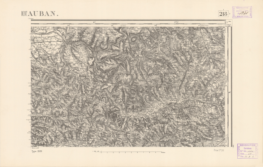 "Paris. Service Géographique de l'Armée, 1889. Ebbe origine dall'Edizione zincografica in quarti di foglio, stabilita dal 1879, per la carta detta de "L'Etat-Major". Infatti non rispondono più il sistema della riproduzione zincografica alle esigenze che la revisione dei fogli imponeva, per un inevitabile logoramento dei rami originali, fu proposta dapprima la correzione degli zinchi, ma questo, importando un lavoro lungo e gravoso, si adottò il procedimento galvanico. I rami galvanici ottenuti e corretti secondo questo sistema presero il nome di "édition type 1889". Allo scopo di facilitare l'incisione fu adoperata la suddivisione in quarti di foglio come per l'edizione zincografica. La revisione dei fogli di questo tipo non fu iniziata che nel 1893. Dal catalogo del S.G.A. risultano mancanti a questa edizione i dipartimenti della "Moselle", del "Bas-Rhin" e del "Haut-Rhin" per i quali non esiste che una edizione in fogli interi aggiornata nel 1901."
