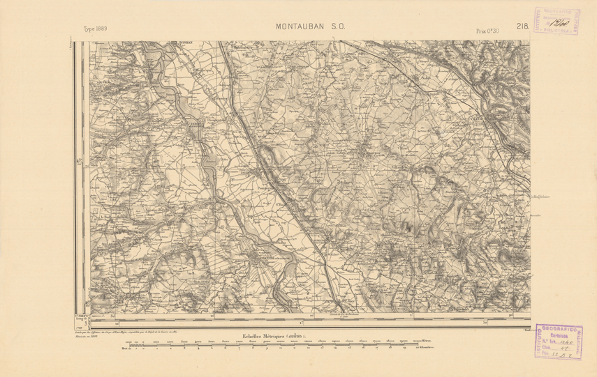 "Paris. Service Géographique de l'Armée, 1889. Ebbe origine dall'Edizione zincografica in quarti di foglio, stabilita dal 1879, per la carta detta de "L'Etat-Major". Infatti non rispondono più il sistema della riproduzione zincografica alle esigenze che la revisione dei fogli imponeva, per un inevitabile logoramento dei rami originali, fu proposta dapprima la correzione degli zinchi, ma questo, importando un lavoro lungo e gravoso, si adottò il procedimento galvanico. I rami galvanici ottenuti e corretti secondo questo sistema presero il nome di "édition type 1889". Allo scopo di facilitare l'incisione fu adoperata la suddivisione in quarti di foglio come per l'edizione zincografica. La revisione dei fogli di questo tipo non fu iniziata che nel 1893. Dal catalogo del S.G.A. risultano mancanti a questa edizione i dipartimenti della "Moselle", del "Bas-Rhin" e del "Haut-Rhin" per i quali non esiste che una edizione in fogli interi aggiornata nel 1901."