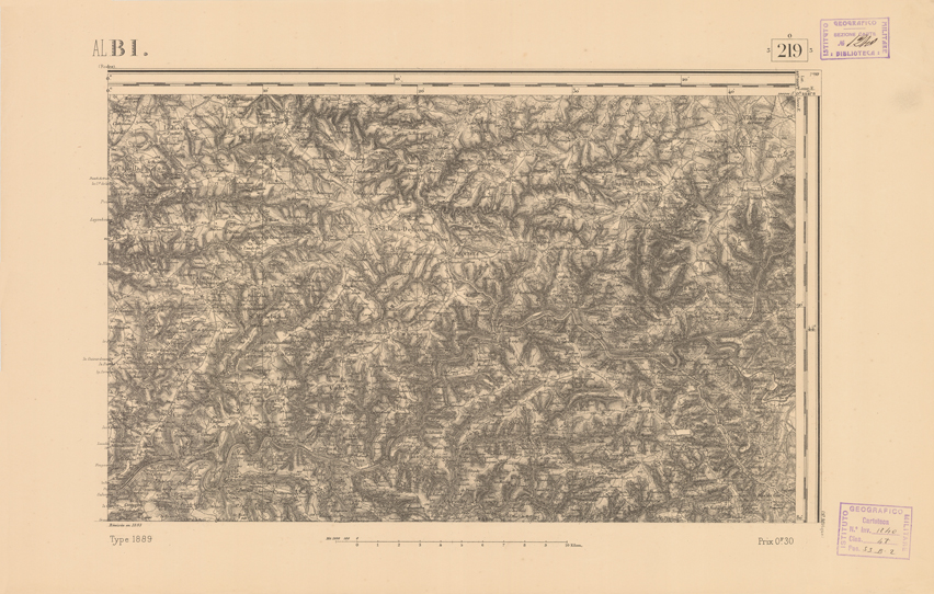 "Paris. Service Géographique de l'Armée, 1889. Ebbe origine dall'Edizione zincografica in quarti di foglio, stabilita dal 1879, per la carta detta de "L'Etat-Major". Infatti non rispondono più il sistema della riproduzione zincografica alle esigenze che la revisione dei fogli imponeva, per un inevitabile logoramento dei rami originali, fu proposta dapprima la correzione degli zinchi, ma questo, importando un lavoro lungo e gravoso, si adottò il procedimento galvanico. I rami galvanici ottenuti e corretti secondo questo sistema presero il nome di "édition type 1889". Allo scopo di facilitare l'incisione fu adoperata la suddivisione in quarti di foglio come per l'edizione zincografica. La revisione dei fogli di questo tipo non fu iniziata che nel 1893. Dal catalogo del S.G.A. risultano mancanti a questa edizione i dipartimenti della "Moselle", del "Bas-Rhin" e del "Haut-Rhin" per i quali non esiste che una edizione in fogli interi aggiornata nel 1901."