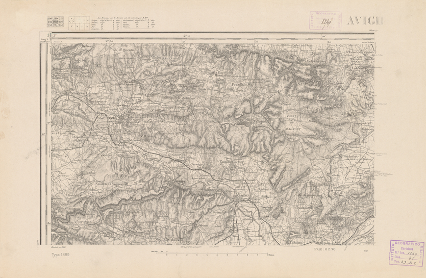"Paris. Service Géographique de l'Armée, 1889. Ebbe origine dall'Edizione zincografica in quarti di foglio, stabilita dal 1879, per la carta detta de "L'Etat-Major". Infatti non rispondono più il sistema della riproduzione zincografica alle esigenze che la revisione dei fogli imponeva, per un inevitabile logoramento dei rami originali, fu proposta dapprima la correzione degli zinchi, ma questo, importando un lavoro lungo e gravoso, si adottò il procedimento galvanico. I rami galvanici ottenuti e corretti secondo questo sistema presero il nome di "édition type 1889". Allo scopo di facilitare l'incisione fu adoperata la suddivisione in quarti di foglio come per l'edizione zincografica. La revisione dei fogli di questo tipo non fu iniziata che nel 1893. Dal catalogo del S.G.A. risultano mancanti a questa edizione i dipartimenti della "Moselle", del "Bas-Rhin" e del "Haut-Rhin" per i quali non esiste che una edizione in fogli interi aggiornata nel 1901."