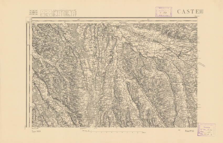"Paris. Service Géographique de l'Armée, 1889. Ebbe origine dall'Edizione zincografica in quarti di foglio, stabilita dal 1879, per la carta detta de "L'Etat-Major". Infatti non rispondono più il sistema della riproduzione zincografica alle esigenze che la revisione dei fogli imponeva, per un inevitabile logoramento dei rami originali, fu proposta dapprima la correzione degli zinchi, ma questo, importando un lavoro lungo e gravoso, si adottò il procedimento galvanico. I rami galvanici ottenuti e corretti secondo questo sistema presero il nome di "édition type 1889". Allo scopo di facilitare l'incisione fu adoperata la suddivisione in quarti di foglio come per l'edizione zincografica. La revisione dei fogli di questo tipo non fu iniziata che nel 1893. Dal catalogo del S.G.A. risultano mancanti a questa edizione i dipartimenti della "Moselle", del "Bas-Rhin" e del "Haut-Rhin" per i quali non esiste che una edizione in fogli interi aggiornata nel 1901."