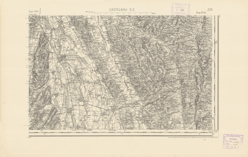 "Paris. Service Géographique de l'Armée, 1889. Ebbe origine dall'Edizione zincografica in quarti di foglio, stabilita dal 1879, per la carta detta de "L'Etat-Major". Infatti non rispondono più il sistema della riproduzione zincografica alle esigenze che la revisione dei fogli imponeva, per un inevitabile logoramento dei rami originali, fu proposta dapprima la correzione degli zinchi, ma questo, importando un lavoro lungo e gravoso, si adottò il procedimento galvanico. I rami galvanici ottenuti e corretti secondo questo sistema presero il nome di "édition type 1889". Allo scopo di facilitare l'incisione fu adoperata la suddivisione in quarti di foglio come per l'edizione zincografica. La revisione dei fogli di questo tipo non fu iniziata che nel 1893. Dal catalogo del S.G.A. risultano mancanti a questa edizione i dipartimenti della "Moselle", del "Bas-Rhin" e del "Haut-Rhin" per i quali non esiste che una edizione in fogli interi aggiornata nel 1901."