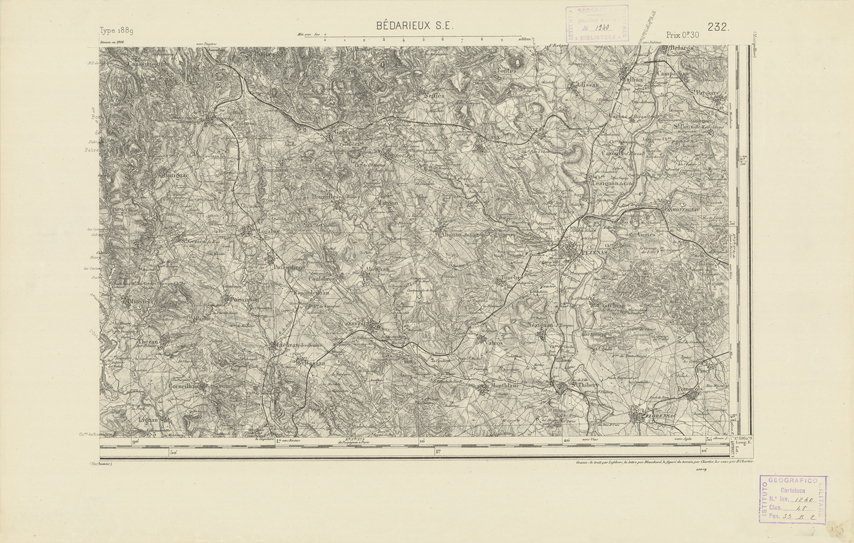 "Paris. Service Géographique de l'Armée, 1889. Ebbe origine dall'Edizione zincografica in quarti di foglio, stabilita dal 1879, per la carta detta de "L'Etat-Major". Infatti non rispondono più il sistema della riproduzione zincografica alle esigenze che la revisione dei fogli imponeva, per un inevitabile logoramento dei rami originali, fu proposta dapprima la correzione degli zinchi, ma questo, importando un lavoro lungo e gravoso, si adottò il procedimento galvanico. I rami galvanici ottenuti e corretti secondo questo sistema presero il nome di "édition type 1889". Allo scopo di facilitare l'incisione fu adoperata la suddivisione in quarti di foglio come per l'edizione zincografica. La revisione dei fogli di questo tipo non fu iniziata che nel 1893. Dal catalogo del S.G.A. risultano mancanti a questa edizione i dipartimenti della "Moselle", del "Bas-Rhin" e del "Haut-Rhin" per i quali non esiste che una edizione in fogli interi aggiornata nel 1901."