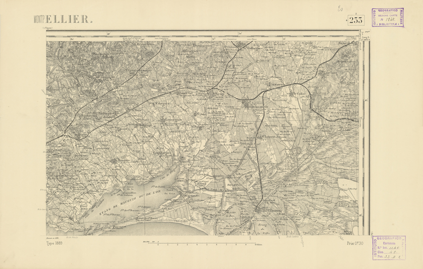 "Paris. Service Géographique de l'Armée, 1889. Ebbe origine dall'Edizione zincografica in quarti di foglio, stabilita dal 1879, per la carta detta de "L'Etat-Major". Infatti non rispondono più il sistema della riproduzione zincografica alle esigenze che la revisione dei fogli imponeva, per un inevitabile logoramento dei rami originali, fu proposta dapprima la correzione degli zinchi, ma questo, importando un lavoro lungo e gravoso, si adottò il procedimento galvanico. I rami galvanici ottenuti e corretti secondo questo sistema presero il nome di "édition type 1889". Allo scopo di facilitare l'incisione fu adoperata la suddivisione in quarti di foglio come per l'edizione zincografica. La revisione dei fogli di questo tipo non fu iniziata che nel 1893. Dal catalogo del S.G.A. risultano mancanti a questa edizione i dipartimenti della "Moselle", del "Bas-Rhin" e del "Haut-Rhin" per i quali non esiste che una edizione in fogli interi aggiornata nel 1901."