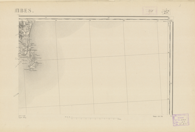 "Paris. Service Géographique de l'Armée, 1889. Ebbe origine dall'Edizione zincografica in quarti di foglio, stabilita dal 1879, per la carta detta de "L'Etat-Major". Infatti non rispondono più il sistema della riproduzione zincografica alle esigenze che la revisione dei fogli imponeva, per un inevitabile logoramento dei rami originali, fu proposta dapprima la correzione degli zinchi, ma questo, importando un lavoro lungo e gravoso, si adottò il procedimento galvanico. I rami galvanici ottenuti e corretti secondo questo sistema presero il nome di "édition type 1889". Allo scopo di facilitare l'incisione fu adoperata la suddivisione in quarti di foglio come per l'edizione zincografica. La revisione dei fogli di questo tipo non fu iniziata che nel 1893. Dal catalogo del S.G.A. risultano mancanti a questa edizione i dipartimenti della "Moselle", del "Bas-Rhin" e del "Haut-Rhin" per i quali non esiste che una edizione in fogli interi aggiornata nel 1901."
