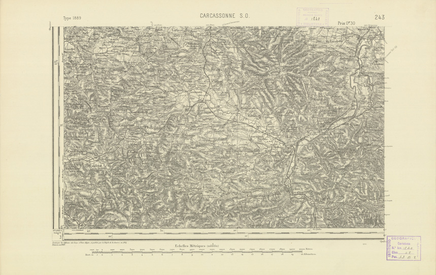 "Paris. Service Géographique de l'Armée, 1889. Ebbe origine dall'Edizione zincografica in quarti di foglio, stabilita dal 1879, per la carta detta de "L'Etat-Major". Infatti non rispondono più il sistema della riproduzione zincografica alle esigenze che la revisione dei fogli imponeva, per un inevitabile logoramento dei rami originali, fu proposta dapprima la correzione degli zinchi, ma questo, importando un lavoro lungo e gravoso, si adottò il procedimento galvanico. I rami galvanici ottenuti e corretti secondo questo sistema presero il nome di "édition type 1889". Allo scopo di facilitare l'incisione fu adoperata la suddivisione in quarti di foglio come per l'edizione zincografica. La revisione dei fogli di questo tipo non fu iniziata che nel 1893. Dal catalogo del S.G.A. risultano mancanti a questa edizione i dipartimenti della "Moselle", del "Bas-Rhin" e del "Haut-Rhin" per i quali non esiste che una edizione in fogli interi aggiornata nel 1901."
