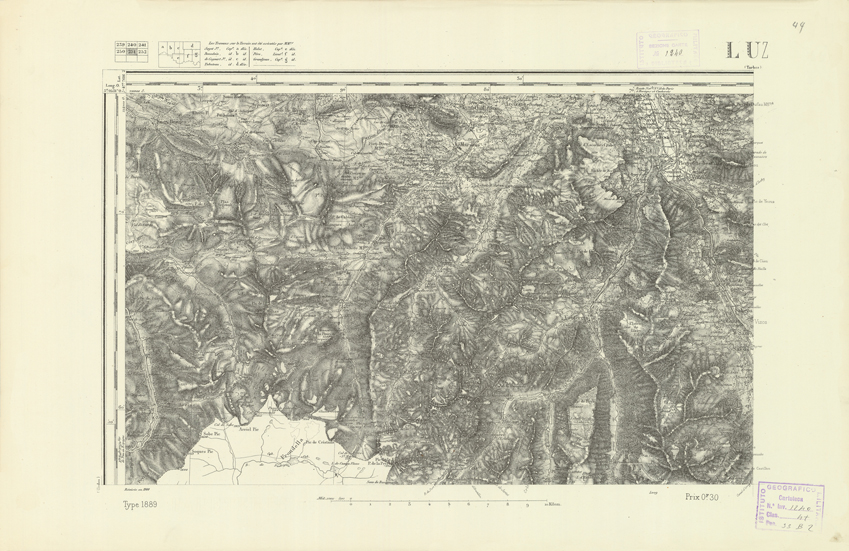 "Paris. Service Géographique de l'Armée, 1889. Ebbe origine dall'Edizione zincografica in quarti di foglio, stabilita dal 1879, per la carta detta de "L'Etat-Major". Infatti non rispondono più il sistema della riproduzione zincografica alle esigenze che la revisione dei fogli imponeva, per un inevitabile logoramento dei rami originali, fu proposta dapprima la correzione degli zinchi, ma questo, importando un lavoro lungo e gravoso, si adottò il procedimento galvanico. I rami galvanici ottenuti e corretti secondo questo sistema presero il nome di "édition type 1889". Allo scopo di facilitare l'incisione fu adoperata la suddivisione in quarti di foglio come per l'edizione zincografica. La revisione dei fogli di questo tipo non fu iniziata che nel 1893. Dal catalogo del S.G.A. risultano mancanti a questa edizione i dipartimenti della "Moselle", del "Bas-Rhin" e del "Haut-Rhin" per i quali non esiste che una edizione in fogli interi aggiornata nel 1901."