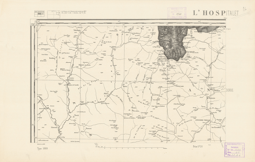 "Paris. Service Géographique de l'Armée, 1889. Ebbe origine dall'Edizione zincografica in quarti di foglio, stabilita dal 1879, per la carta detta de "L'Etat-Major". Infatti non rispondono più il sistema della riproduzione zincografica alle esigenze che la revisione dei fogli imponeva, per un inevitabile logoramento dei rami originali, fu proposta dapprima la correzione degli zinchi, ma questo, importando un lavoro lungo e gravoso, si adottò il procedimento galvanico. I rami galvanici ottenuti e corretti secondo questo sistema presero il nome di "édition type 1889". Allo scopo di facilitare l'incisione fu adoperata la suddivisione in quarti di foglio come per l'edizione zincografica. La revisione dei fogli di questo tipo non fu iniziata che nel 1893. Dal catalogo del S.G.A. risultano mancanti a questa edizione i dipartimenti della "Moselle", del "Bas-Rhin" e del "Haut-Rhin" per i quali non esiste che una edizione in fogli interi aggiornata nel 1901."