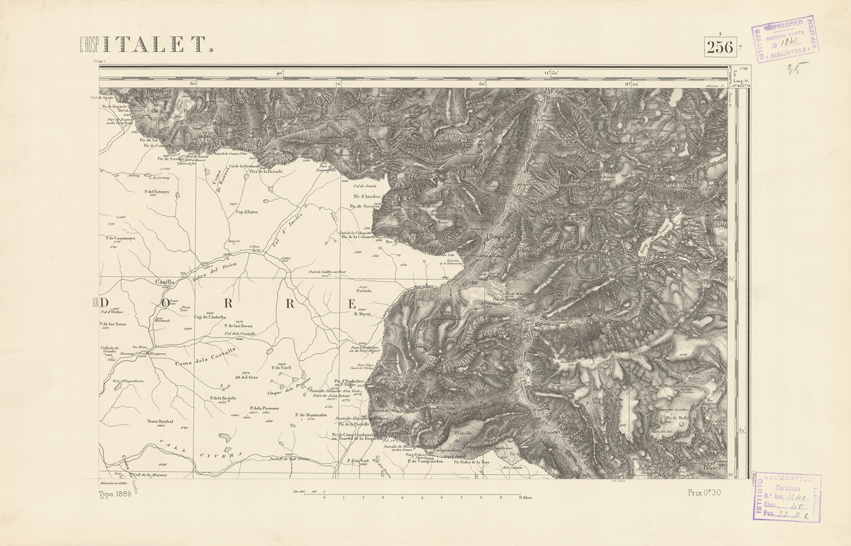 "Paris. Service Géographique de l'Armée, 1889. Ebbe origine dall'Edizione zincografica in quarti di foglio, stabilita dal 1879, per la carta detta de "L'Etat-Major". Infatti non rispondono più il sistema della riproduzione zincografica alle esigenze che la revisione dei fogli imponeva, per un inevitabile logoramento dei rami originali, fu proposta dapprima la correzione degli zinchi, ma questo, importando un lavoro lungo e gravoso, si adottò il procedimento galvanico. I rami galvanici ottenuti e corretti secondo questo sistema presero il nome di "édition type 1889". Allo scopo di facilitare l'incisione fu adoperata la suddivisione in quarti di foglio come per l'edizione zincografica. La revisione dei fogli di questo tipo non fu iniziata che nel 1893. Dal catalogo del S.G.A. risultano mancanti a questa edizione i dipartimenti della "Moselle", del "Bas-Rhin" e del "Haut-Rhin" per i quali non esiste che una edizione in fogli interi aggiornata nel 1901."
