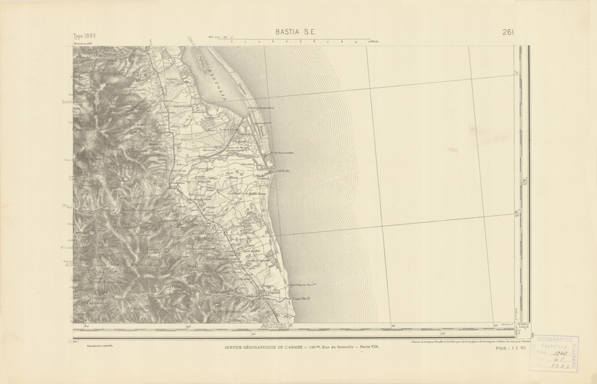 "Paris. Service Géographique de l'Armée, 1889. Ebbe origine dall'Edizione zincografica in quarti di foglio, stabilita dal 1879, per la carta detta de "L'Etat-Major". Infatti non rispondono più il sistema della riproduzione zincografica alle esigenze che la revisione dei fogli imponeva, per un inevitabile logoramento dei rami originali, fu proposta dapprima la correzione degli zinchi, ma questo, importando un lavoro lungo e gravoso, si adottò il procedimento galvanico. I rami galvanici ottenuti e corretti secondo questo sistema presero il nome di "édition type 1889". Allo scopo di facilitare l'incisione fu adoperata la suddivisione in quarti di foglio come per l'edizione zincografica. La revisione dei fogli di questo tipo non fu iniziata che nel 1893. Dal catalogo del S.G.A. risultano mancanti a questa edizione i dipartimenti della "Moselle", del "Bas-Rhin" e del "Haut-Rhin" per i quali non esiste che una edizione in fogli interi aggiornata nel 1901."