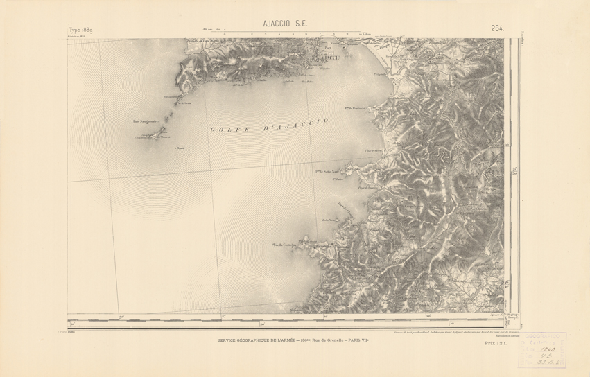 "Paris. Service Géographique de l'Armée, 1889. Ebbe origine dall'Edizione zincografica in quarti di foglio, stabilita dal 1879, per la carta detta de "L'Etat-Major". Infatti non rispondono più il sistema della riproduzione zincografica alle esigenze che la revisione dei fogli imponeva, per un inevitabile logoramento dei rami originali, fu proposta dapprima la correzione degli zinchi, ma questo, importando un lavoro lungo e gravoso, si adottò il procedimento galvanico. I rami galvanici ottenuti e corretti secondo questo sistema presero il nome di "édition type 1889". Allo scopo di facilitare l'incisione fu adoperata la suddivisione in quarti di foglio come per l'edizione zincografica. La revisione dei fogli di questo tipo non fu iniziata che nel 1893. Dal catalogo del S.G.A. risultano mancanti a questa edizione i dipartimenti della "Moselle", del "Bas-Rhin" e del "Haut-Rhin" per i quali non esiste che una edizione in fogli interi aggiornata nel 1901."