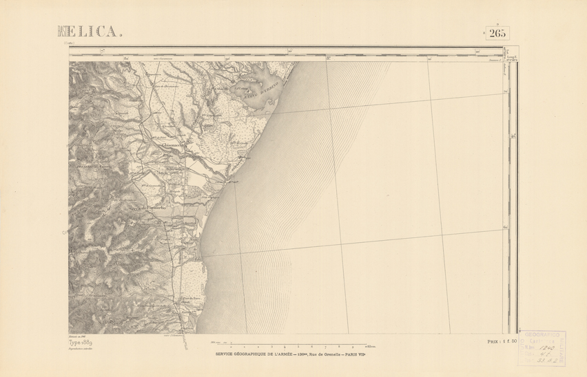 "Paris. Service Géographique de l'Armée, 1889. Ebbe origine dall'Edizione zincografica in quarti di foglio, stabilita dal 1879, per la carta detta de "L'Etat-Major". Infatti non rispondono più il sistema della riproduzione zincografica alle esigenze che la revisione dei fogli imponeva, per un inevitabile logoramento dei rami originali, fu proposta dapprima la correzione degli zinchi, ma questo, importando un lavoro lungo e gravoso, si adottò il procedimento galvanico. I rami galvanici ottenuti e corretti secondo questo sistema presero il nome di "édition type 1889". Allo scopo di facilitare l'incisione fu adoperata la suddivisione in quarti di foglio come per l'edizione zincografica. La revisione dei fogli di questo tipo non fu iniziata che nel 1893. Dal catalogo del S.G.A. risultano mancanti a questa edizione i dipartimenti della "Moselle", del "Bas-Rhin" e del "Haut-Rhin" per i quali non esiste che una edizione in fogli interi aggiornata nel 1901."