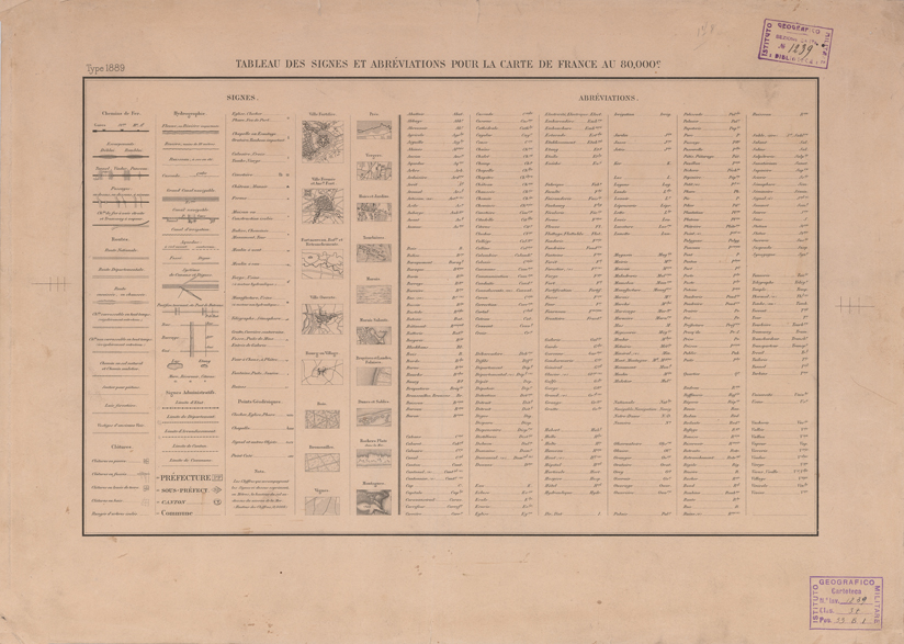 "Paris. - Service Géograèhique de l'Armée, 1889. Ebbe origine dall'Edizione zincografica in quarti di foglio, stabilita fino dal 1879, per la Carta detta de "L'etat-Major". Infatti non rispondendo più il sistema della riproduzione zincografica alle esigenze che la revisione dei fogli imponeva per un inevitabile logoramento dei rami originali, fu proposta dapprima la correzione degli zinchi, ma questo, importando un lavoro lungo e gravoso, si adottò il procedimento galvanico. I rami galvanici ottenuti e corretti secondo questo sistema presero il nome di "édition type 1889". Allo scopo di facilitare l'incisione fu adoperata la suddivisione in quarti di foglio come per l'edizione zincografica. la revisione dei fogli di questo tipo nnn fu iniziata che nel 1893. Dal catalogo del S.G.A. risultano mancanti a questa edizione i dipartimenti della "Moselle", del "Bas-Rhin" e del "Haut-Rhin" per le quali non esiste che una edizione in fogli interi aggiornata nel 1901."