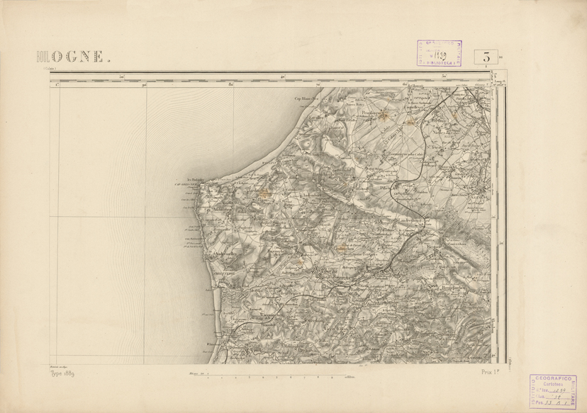 "Paris. - Service Géograèhique de l'Armée, 1889. Ebbe origine dall'Edizione zincografica in quarti di foglio, stabilita fino dal 1879, per la Carta detta de "L'etat-Major". Infatti non rispondendo più il sistema della riproduzione zincografica alle esigenze che la revisione dei fogli imponeva per un inevitabile logoramento dei rami originali, fu proposta dapprima la correzione degli zinchi, ma questo, importando un lavoro lungo e gravoso, si adottò il procedimento galvanico. I rami galvanici ottenuti e corretti secondo questo sistema presero il nome di "édition type 1889". Allo scopo di facilitare l'incisione fu adoperata la suddivisione in quarti di foglio come per l'edizione zincografica. la revisione dei fogli di questo tipo nnn fu iniziata che nel 1893. Dal catalogo del S.G.A. risultano mancanti a questa edizione i dipartimenti della "Moselle", del "Bas-Rhin" e del "Haut-Rhin" per le quali non esiste che una edizione in fogli interi aggiornata nel 1901."