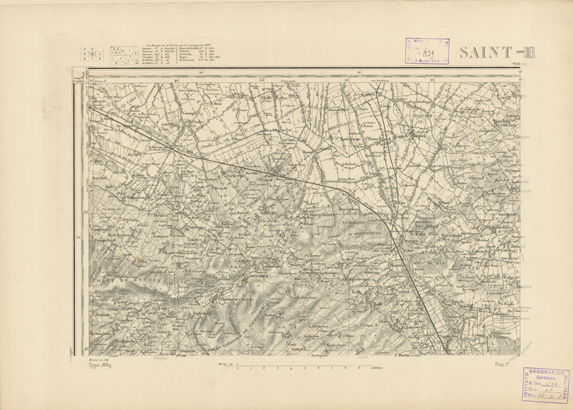 "Paris. - Service Géograèhique de l'Armée, 1889. Ebbe origine dall'Edizione zincografica in quarti di foglio, stabilita fino dal 1879, per la Carta detta de "L'etat-Major". Infatti non rispondendo più il sistema della riproduzione zincografica alle esigenze che la revisione dei fogli imponeva per un inevitabile logoramento dei rami originali, fu proposta dapprima la correzione degli zinchi, ma questo, importando un lavoro lungo e gravoso, si adottò il procedimento galvanico. I rami galvanici ottenuti e corretti secondo questo sistema presero il nome di "édition type 1889". Allo scopo di facilitare l'incisione fu adoperata la suddivisione in quarti di foglio come per l'edizione zincografica. la revisione dei fogli di questo tipo nnn fu iniziata che nel 1893. Dal catalogo del S.G.A. risultano mancanti a questa edizione i dipartimenti della "Moselle", del "Bas-Rhin" e del "Haut-Rhin" per le quali non esiste che una edizione in fogli interi aggiornata nel 1901."