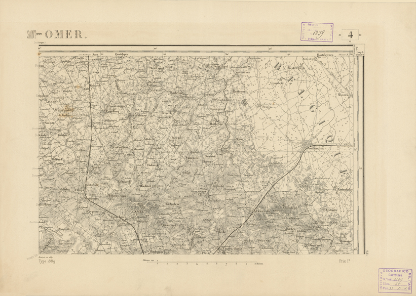 "Paris. - Service Géograèhique de l'Armée, 1889. Ebbe origine dall'Edizione zincografica in quarti di foglio, stabilita fino dal 1879, per la Carta detta de "L'etat-Major". Infatti non rispondendo più il sistema della riproduzione zincografica alle esigenze che la revisione dei fogli imponeva per un inevitabile logoramento dei rami originali, fu proposta dapprima la correzione degli zinchi, ma questo, importando un lavoro lungo e gravoso, si adottò il procedimento galvanico. I rami galvanici ottenuti e corretti secondo questo sistema presero il nome di "édition type 1889". Allo scopo di facilitare l'incisione fu adoperata la suddivisione in quarti di foglio come per l'edizione zincografica. la revisione dei fogli di questo tipo nnn fu iniziata che nel 1893. Dal catalogo del S.G.A. risultano mancanti a questa edizione i dipartimenti della "Moselle", del "Bas-Rhin" e del "Haut-Rhin" per le quali non esiste che una edizione in fogli interi aggiornata nel 1901."
