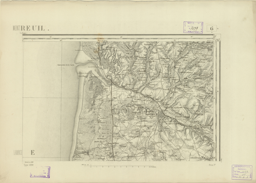 "Paris. - Service Géograèhique de l'Armée, 1889. Ebbe origine dall'Edizione zincografica in quarti di foglio, stabilita fino dal 1879, per la Carta detta de "L'etat-Major". Infatti non rispondendo più il sistema della riproduzione zincografica alle esigenze che la revisione dei fogli imponeva per un inevitabile logoramento dei rami originali, fu proposta dapprima la correzione degli zinchi, ma questo, importando un lavoro lungo e gravoso, si adottò il procedimento galvanico. I rami galvanici ottenuti e corretti secondo questo sistema presero il nome di "édition type 1889". Allo scopo di facilitare l'incisione fu adoperata la suddivisione in quarti di foglio come per l'edizione zincografica. la revisione dei fogli di questo tipo nnn fu iniziata che nel 1893. Dal catalogo del S.G.A. risultano mancanti a questa edizione i dipartimenti della "Moselle", del "Bas-Rhin" e del "Haut-Rhin" per le quali non esiste che una edizione in fogli interi aggiornata nel 1901."