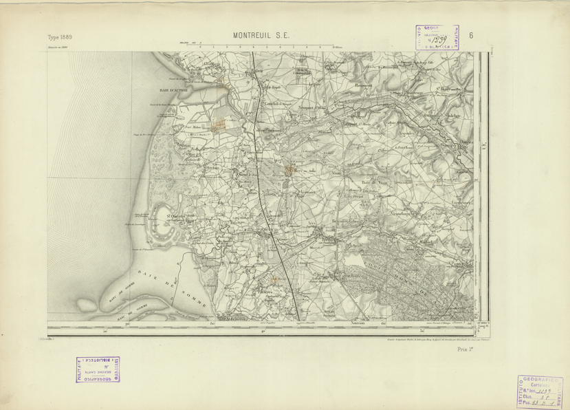 "Paris. - Service Géograèhique de l'Armée, 1889. Ebbe origine dall'Edizione zincografica in quarti di foglio, stabilita fino dal 1879, per la Carta detta de "L'etat-Major". Infatti non rispondendo più il sistema della riproduzione zincografica alle esigenze che la revisione dei fogli imponeva per un inevitabile logoramento dei rami originali, fu proposta dapprima la correzione degli zinchi, ma questo, importando un lavoro lungo e gravoso, si adottò il procedimento galvanico. I rami galvanici ottenuti e corretti secondo questo sistema presero il nome di "édition type 1889". Allo scopo di facilitare l'incisione fu adoperata la suddivisione in quarti di foglio come per l'edizione zincografica. la revisione dei fogli di questo tipo nnn fu iniziata che nel 1893. Dal catalogo del S.G.A. risultano mancanti a questa edizione i dipartimenti della "Moselle", del "Bas-Rhin" e del "Haut-Rhin" per le quali non esiste che una edizione in fogli interi aggiornata nel 1901."