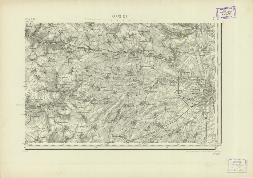 "Paris. - Service Géograèhique de l'Armée, 1889. Ebbe origine dall'Edizione zincografica in quarti di foglio, stabilita fino dal 1879, per la Carta detta de "L'etat-Major". Infatti non rispondendo più il sistema della riproduzione zincografica alle esigenze che la revisione dei fogli imponeva per un inevitabile logoramento dei rami originali, fu proposta dapprima la correzione degli zinchi, ma questo, importando un lavoro lungo e gravoso, si adottò il procedimento galvanico. I rami galvanici ottenuti e corretti secondo questo sistema presero il nome di "édition type 1889". Allo scopo di facilitare l'incisione fu adoperata la suddivisione in quarti di foglio come per l'edizione zincografica. la revisione dei fogli di questo tipo nnn fu iniziata che nel 1893. Dal catalogo del S.G.A. risultano mancanti a questa edizione i dipartimenti della "Moselle", del "Bas-Rhin" e del "Haut-Rhin" per le quali non esiste che una edizione in fogli interi aggiornata nel 1901."
