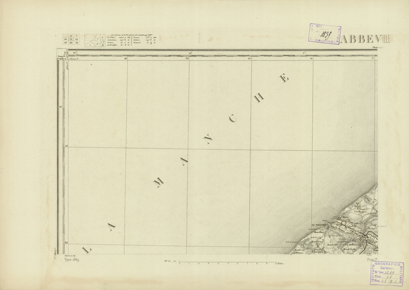 "Paris. - Service Géograèhique de l'Armée, 1889. Ebbe origine dall'Edizione zincografica in quarti di foglio, stabilita fino dal 1879, per la Carta detta de "L'etat-Major". Infatti non rispondendo più il sistema della riproduzione zincografica alle esigenze che la revisione dei fogli imponeva per un inevitabile logoramento dei rami originali, fu proposta dapprima la correzione degli zinchi, ma questo, importando un lavoro lungo e gravoso, si adottò il procedimento galvanico. I rami galvanici ottenuti e corretti secondo questo sistema presero il nome di "édition type 1889". Allo scopo di facilitare l'incisione fu adoperata la suddivisione in quarti di foglio come per l'edizione zincografica. la revisione dei fogli di questo tipo nnn fu iniziata che nel 1893. Dal catalogo del S.G.A. risultano mancanti a questa edizione i dipartimenti della "Moselle", del "Bas-Rhin" e del "Haut-Rhin" per le quali non esiste che una edizione in fogli interi aggiornata nel 1901."
