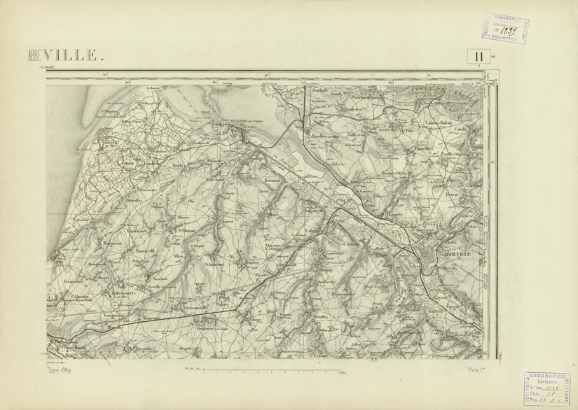 "Paris. - Service Géograèhique de l'Armée, 1889. Ebbe origine dall'Edizione zincografica in quarti di foglio, stabilita fino dal 1879, per la Carta detta de "L'etat-Major". Infatti non rispondendo più il sistema della riproduzione zincografica alle esigenze che la revisione dei fogli imponeva per un inevitabile logoramento dei rami originali, fu proposta dapprima la correzione degli zinchi, ma questo, importando un lavoro lungo e gravoso, si adottò il procedimento galvanico. I rami galvanici ottenuti e corretti secondo questo sistema presero il nome di "édition type 1889". Allo scopo di facilitare l'incisione fu adoperata la suddivisione in quarti di foglio come per l'edizione zincografica. la revisione dei fogli di questo tipo nnn fu iniziata che nel 1893. Dal catalogo del S.G.A. risultano mancanti a questa edizione i dipartimenti della "Moselle", del "Bas-Rhin" e del "Haut-Rhin" per le quali non esiste che una edizione in fogli interi aggiornata nel 1901."