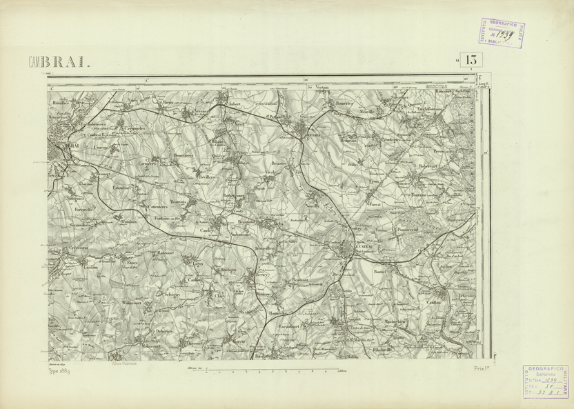 "Paris. - Service Géograèhique de l'Armée, 1889. Ebbe origine dall'Edizione zincografica in quarti di foglio, stabilita fino dal 1879, per la Carta detta de "L'etat-Major". Infatti non rispondendo più il sistema della riproduzione zincografica alle esigenze che la revisione dei fogli imponeva per un inevitabile logoramento dei rami originali, fu proposta dapprima la correzione degli zinchi, ma questo, importando un lavoro lungo e gravoso, si adottò il procedimento galvanico. I rami galvanici ottenuti e corretti secondo questo sistema presero il nome di "édition type 1889". Allo scopo di facilitare l'incisione fu adoperata la suddivisione in quarti di foglio come per l'edizione zincografica. la revisione dei fogli di questo tipo nnn fu iniziata che nel 1893. Dal catalogo del S.G.A. risultano mancanti a questa edizione i dipartimenti della "Moselle", del "Bas-Rhin" e del "Haut-Rhin" per le quali non esiste che una edizione in fogli interi aggiornata nel 1901."