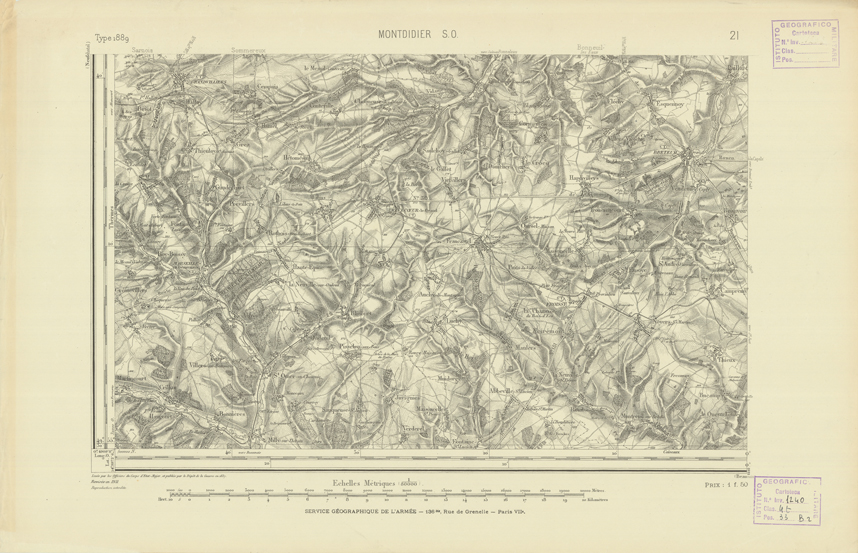 "Paris. - Service Géograèhique de l'Armée, 1889. Ebbe origine dall'Edizione zincografica in quarti di foglio, stabilita fino dal 1879, per la Carta detta de "L'etat-Major". Infatti non rispondendo più il sistema della riproduzione zincografica alle esigenze che la revisione dei fogli imponeva per un inevitabile logoramento dei rami originali, fu proposta dapprima la correzione degli zinchi, ma questo, importando un lavoro lungo e gravoso, si adottò il procedimento galvanico. I rami galvanici ottenuti e corretti secondo questo sistema presero il nome di "édition type 1889". Allo scopo di facilitare l'incisione fu adoperata la suddivisione in quarti di foglio come per l'edizione zincografica. la revisione dei fogli di questo tipo nnn fu iniziata che nel 1893. Dal catalogo del S.G.A. risultano mancanti a questa edizione i dipartimenti della "Moselle", del "Bas-Rhin" e del "Haut-Rhin" per le quali non esiste che una edizione in fogli interi aggiornata nel 1901."