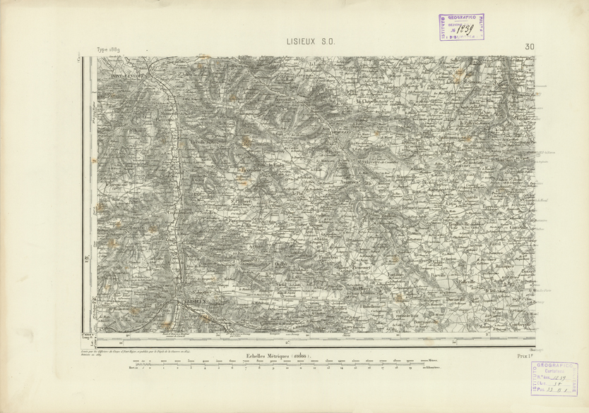 "Paris. - Service Géograèhique de l'Armée, 1889. Ebbe origine dall'Edizione zincografica in quarti di foglio, stabilita fino dal 1879, per la Carta detta de "L'etat-Major". Infatti non rispondendo più il sistema della riproduzione zincografica alle esigenze che la revisione dei fogli imponeva per un inevitabile logoramento dei rami originali, fu proposta dapprima la correzione degli zinchi, ma questo, importando un lavoro lungo e gravoso, si adottò il procedimento galvanico. I rami galvanici ottenuti e corretti secondo questo sistema presero il nome di "édition type 1889". Allo scopo di facilitare l'incisione fu adoperata la suddivisione in quarti di foglio come per l'edizione zincografica. la revisione dei fogli di questo tipo nnn fu iniziata che nel 1893. Dal catalogo del S.G.A. risultano mancanti a questa edizione i dipartimenti della "Moselle", del "Bas-Rhin" e del "Haut-Rhin" per le quali non esiste che una edizione in fogli interi aggiornata nel 1901."