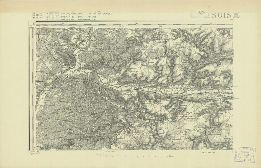 "Paris. - Service Géograèhique de l'Armée, 1889. Ebbe origine dall'Edizione zincografica in quarti di foglio, stabilita fino dal 1879, per la Carta detta de "L'etat-Major". Infatti non rispondendo più il sistema della riproduzione zincografica alle esigenze che la revisione dei fogli imponeva per un inevitabile logoramento dei rami originali, fu proposta dapprima la correzione degli zinchi, ma questo, importando un lavoro lungo e gravoso, si adottò il procedimento galvanico. I rami galvanici ottenuti e corretti secondo questo sistema presero il nome di "édition type 1889". Allo scopo di facilitare l'incisione fu adoperata la suddivisione in quarti di foglio come per l'edizione zincografica. la revisione dei fogli di questo tipo nnn fu iniziata che nel 1893. Dal catalogo del S.G.A. risultano mancanti a questa edizione i dipartimenti della "Moselle", del "Bas-Rhin" e del "Haut-Rhin" per le quali non esiste che una edizione in fogli interi aggiornata nel 1901."
