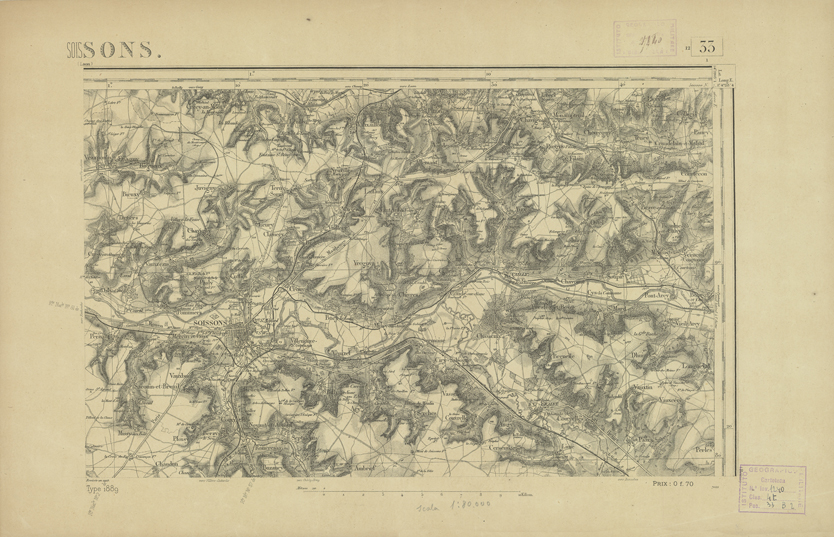 "Paris. - Service Géograèhique de l'Armée, 1889. Ebbe origine dall'Edizione zincografica in quarti di foglio, stabilita fino dal 1879, per la Carta detta de "L'etat-Major". Infatti non rispondendo più il sistema della riproduzione zincografica alle esigenze che la revisione dei fogli imponeva per un inevitabile logoramento dei rami originali, fu proposta dapprima la correzione degli zinchi, ma questo, importando un lavoro lungo e gravoso, si adottò il procedimento galvanico. I rami galvanici ottenuti e corretti secondo questo sistema presero il nome di "édition type 1889". Allo scopo di facilitare l'incisione fu adoperata la suddivisione in quarti di foglio come per l'edizione zincografica. la revisione dei fogli di questo tipo nnn fu iniziata che nel 1893. Dal catalogo del S.G.A. risultano mancanti a questa edizione i dipartimenti della "Moselle", del "Bas-Rhin" e del "Haut-Rhin" per le quali non esiste che una edizione in fogli interi aggiornata nel 1901."