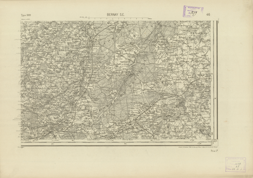 "Paris. - Service Géograèhique de l'Armée, 1889. Ebbe origine dall'Edizione zincografica in quarti di foglio, stabilita fino dal 1879, per la Carta detta de "L'etat-Major". Infatti non rispondendo più il sistema della riproduzione zincografica alle esigenze che la revisione dei fogli imponeva per un inevitabile logoramento dei rami originali, fu proposta dapprima la correzione degli zinchi, ma questo, importando un lavoro lungo e gravoso, si adottò il procedimento galvanico. I rami galvanici ottenuti e corretti secondo questo sistema presero il nome di "édition type 1889". Allo scopo di facilitare l'incisione fu adoperata la suddivisione in quarti di foglio come per l'edizione zincografica. la revisione dei fogli di questo tipo nnn fu iniziata che nel 1893. Dal catalogo del S.G.A. risultano mancanti a questa edizione i dipartimenti della "Moselle", del "Bas-Rhin" e del "Haut-Rhin" per le quali non esiste che una edizione in fogli interi aggiornata nel 1901."