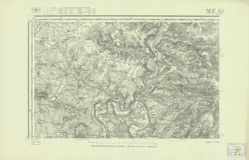 "Paris. - Service Géograèhique de l'Armée, 1889. Ebbe origine dall'Edizione zincografica in quarti di foglio, stabilita fino dal 1879, per la Carta detta de "L'etat-Major". Infatti non rispondendo più il sistema della riproduzione zincografica alle esigenze che la revisione dei fogli imponeva per un inevitabile logoramento dei rami originali, fu proposta dapprima la correzione degli zinchi, ma questo, importando un lavoro lungo e gravoso, si adottò il procedimento galvanico. I rami galvanici ottenuti e corretti secondo questo sistema presero il nome di "édition type 1889". Allo scopo di facilitare l'incisione fu adoperata la suddivisione in quarti di foglio come per l'edizione zincografica. la revisione dei fogli di questo tipo nnn fu iniziata che nel 1893. Dal catalogo del S.G.A. risultano mancanti a questa edizione i dipartimenti della "Moselle", del "Bas-Rhin" e del "Haut-Rhin" per le quali non esiste che una edizione in fogli interi aggiornata nel 1901."