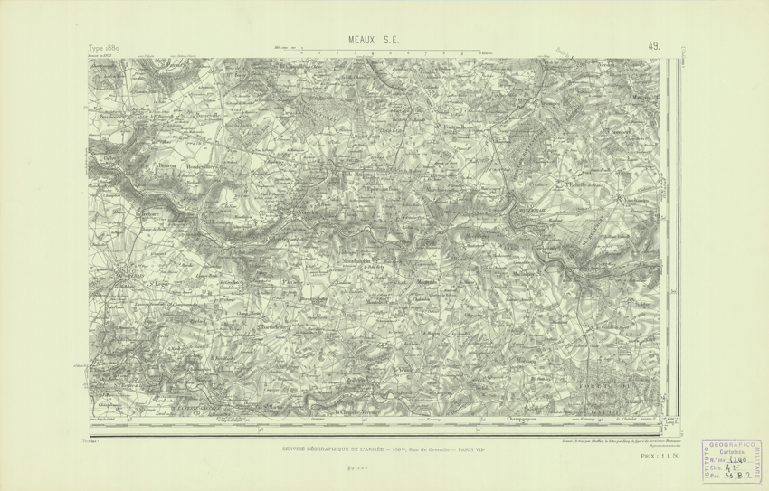 "Paris. - Service Géograèhique de l'Armée, 1889. Ebbe origine dall'Edizione zincografica in quarti di foglio, stabilita fino dal 1879, per la Carta detta de "L'etat-Major". Infatti non rispondendo più il sistema della riproduzione zincografica alle esigenze che la revisione dei fogli imponeva per un inevitabile logoramento dei rami originali, fu proposta dapprima la correzione degli zinchi, ma questo, importando un lavoro lungo e gravoso, si adottò il procedimento galvanico. I rami galvanici ottenuti e corretti secondo questo sistema presero il nome di "édition type 1889". Allo scopo di facilitare l'incisione fu adoperata la suddivisione in quarti di foglio come per l'edizione zincografica. la revisione dei fogli di questo tipo nnn fu iniziata che nel 1893. Dal catalogo del S.G.A. risultano mancanti a questa edizione i dipartimenti della "Moselle", del "Bas-Rhin" e del "Haut-Rhin" per le quali non esiste che una edizione in fogli interi aggiornata nel 1901."