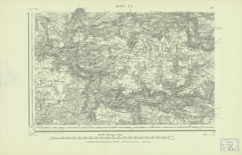 "Paris. - Service Géograèhique de l'Armée, 1889. Ebbe origine dall'Edizione zincografica in quarti di foglio, stabilita fino dal 1879, per la Carta detta de "L'etat-Major". Infatti non rispondendo più il sistema della riproduzione zincografica alle esigenze che la revisione dei fogli imponeva per un inevitabile logoramento dei rami originali, fu proposta dapprima la correzione degli zinchi, ma questo, importando un lavoro lungo e gravoso, si adottò il procedimento galvanico. I rami galvanici ottenuti e corretti secondo questo sistema presero il nome di "édition type 1889". Allo scopo di facilitare l'incisione fu adoperata la suddivisione in quarti di foglio come per l'edizione zincografica. la revisione dei fogli di questo tipo nnn fu iniziata che nel 1893. Dal catalogo del S.G.A. risultano mancanti a questa edizione i dipartimenti della "Moselle", del "Bas-Rhin" e del "Haut-Rhin" per le quali non esiste che una edizione in fogli interi aggiornata nel 1901."