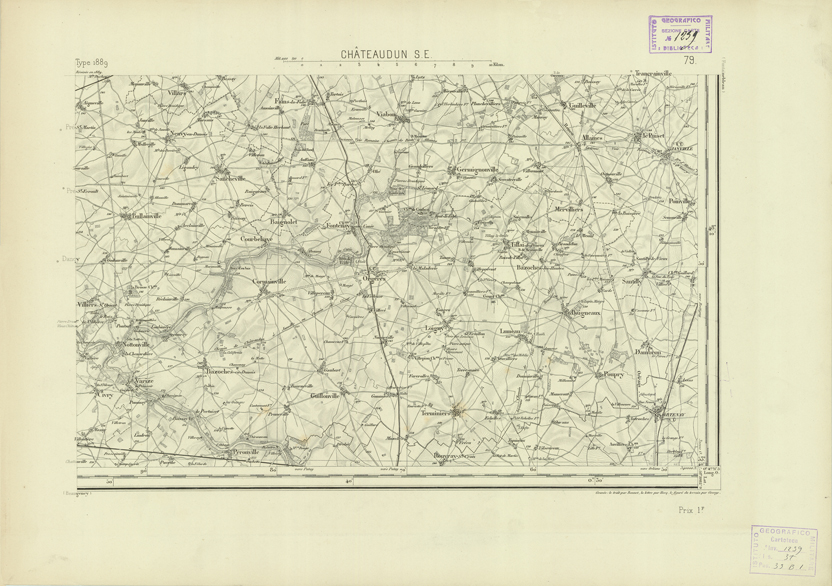 "Paris. - Service Géograèhique de l'Armée, 1889. Ebbe origine dall'Edizione zincografica in quarti di foglio, stabilita fino dal 1879, per la Carta detta de "L'etat-Major". Infatti non rispondendo più il sistema della riproduzione zincografica alle esigenze che la revisione dei fogli imponeva per un inevitabile logoramento dei rami originali, fu proposta dapprima la correzione degli zinchi, ma questo, importando un lavoro lungo e gravoso, si adottò il procedimento galvanico. I rami galvanici ottenuti e corretti secondo questo sistema presero il nome di "édition type 1889". Allo scopo di facilitare l'incisione fu adoperata la suddivisione in quarti di foglio come per l'edizione zincografica. la revisione dei fogli di questo tipo nnn fu iniziata che nel 1893. Dal catalogo del S.G.A. risultano mancanti a questa edizione i dipartimenti della "Moselle", del "Bas-Rhin" e del "Haut-Rhin" per le quali non esiste che una edizione in fogli interi aggiornata nel 1901."