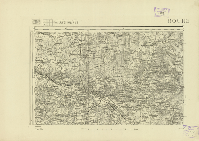 "Paris. - Service Géograèhique de l'Armée, 1889. Ebbe origine dall'Edizione zincografica in quarti di foglio, stabilita fino dal 1879, per la Carta detta de "L'etat-Major". Infatti non rispondendo più il sistema della riproduzione zincografica alle esigenze che la revisione dei fogli imponeva per un inevitabile logoramento dei rami originali, fu proposta dapprima la correzione degli zinchi, ma questo, importando un lavoro lungo e gravoso, si adottò il procedimento galvanico. I rami galvanici ottenuti e corretti secondo questo sistema presero il nome di "édition type 1889". Allo scopo di facilitare l'incisione fu adoperata la suddivisione in quarti di foglio come per l'edizione zincografica. la revisione dei fogli di questo tipo nnn fu iniziata che nel 1893. Dal catalogo del S.G.A. risultano mancanti a questa edizione i dipartimenti della "Moselle", del "Bas-Rhin" e del "Haut-Rhin" per le quali non esiste che una edizione in fogli interi aggiornata nel 1901."